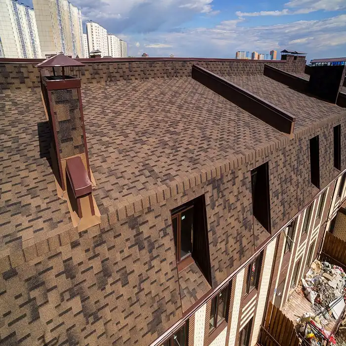 Гибкая черепица может применяться не только на малоэтажных жилых зданиях, но и при строительстве административных, жилых многоэтажных и других типов зданий.